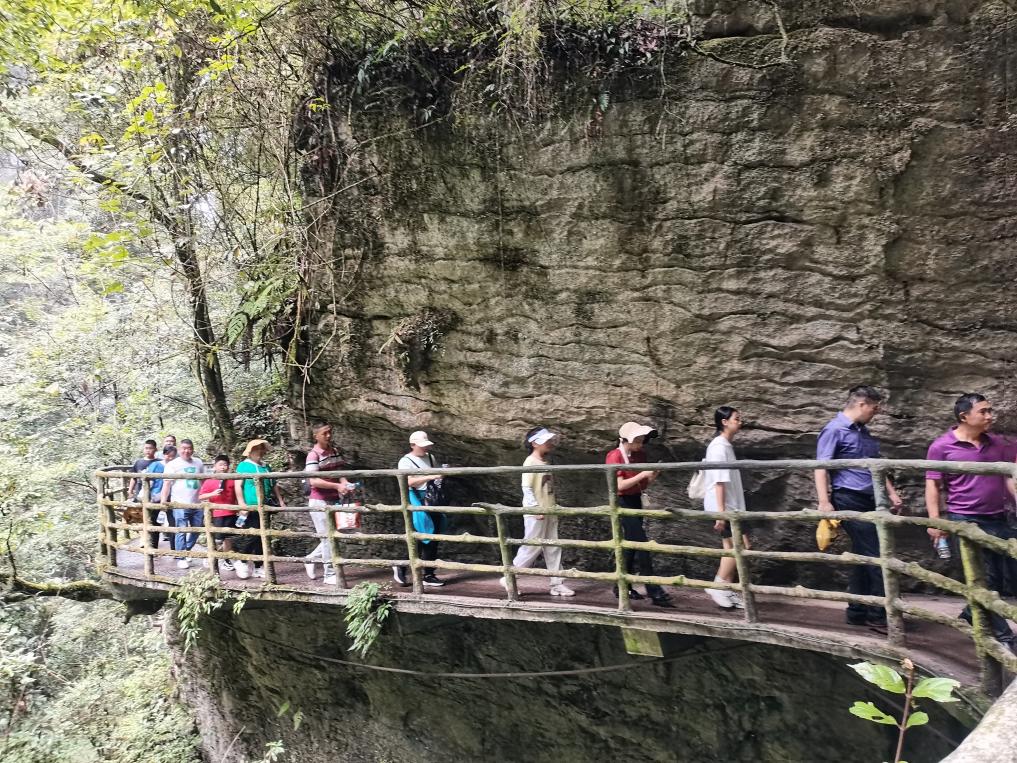 第二天,我們來到國家5A級風景區(qū)——恩施大峽谷,欣賞地球上最美的傷痕——云龍地縫。大家一路斗志昂揚,沿著鑲在懸崖峭壁之上的棧道上下穿行,感嘆大自然的鬼斧神工和生命的渺小與偉大。